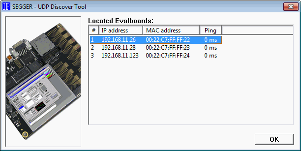 The "UDPDiscoverGUI.exe" from the "\Start\Windows\IP\UDPDiscover" folder of the eval package can be used to send out a simple UDP broadcast discover packet. When this packet is received by the embOS/IP Switch Board it answers back with an unicast UDP packet and the answering devices will be listed by the UDP Discover tool.