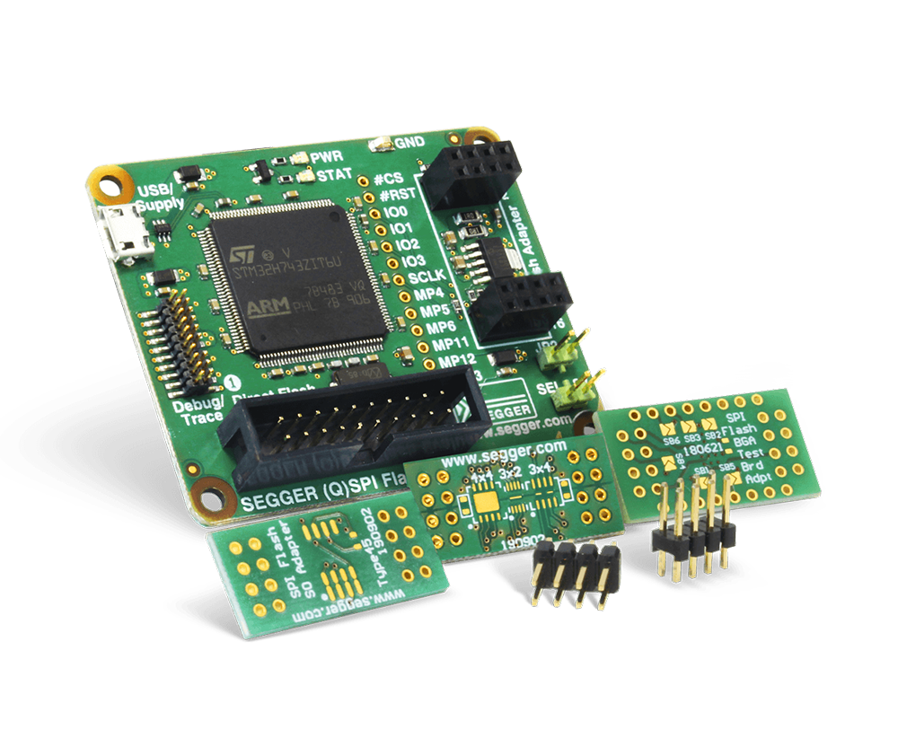 The SEGGER (Q)SPI Flash Evaluator streamlines flash memory evaluation by providing a modular and efficient testing environment. Ready to use out of the box, it is assembled with an adapter board that is populated with the ISSI IS25LPO64D flash chip. Furthermore, it supports a wide range of SPI and QSPI flash devices.