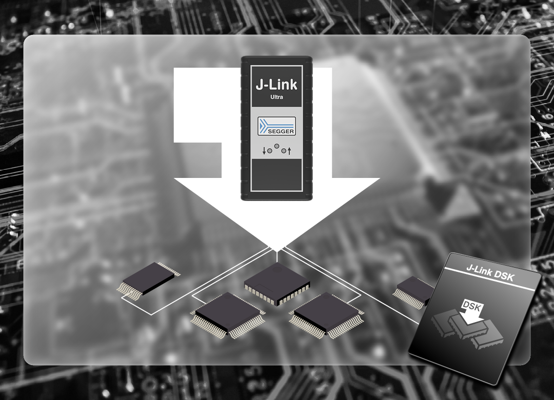 An illustration of a J-Link debugger connected to multiple microchips, demonstrating a programming or debugging process. The J-Link device is shown at the top with an arrow pointing down toward the microchips, indicating data flow. A J-Link DSK is also present on the right.