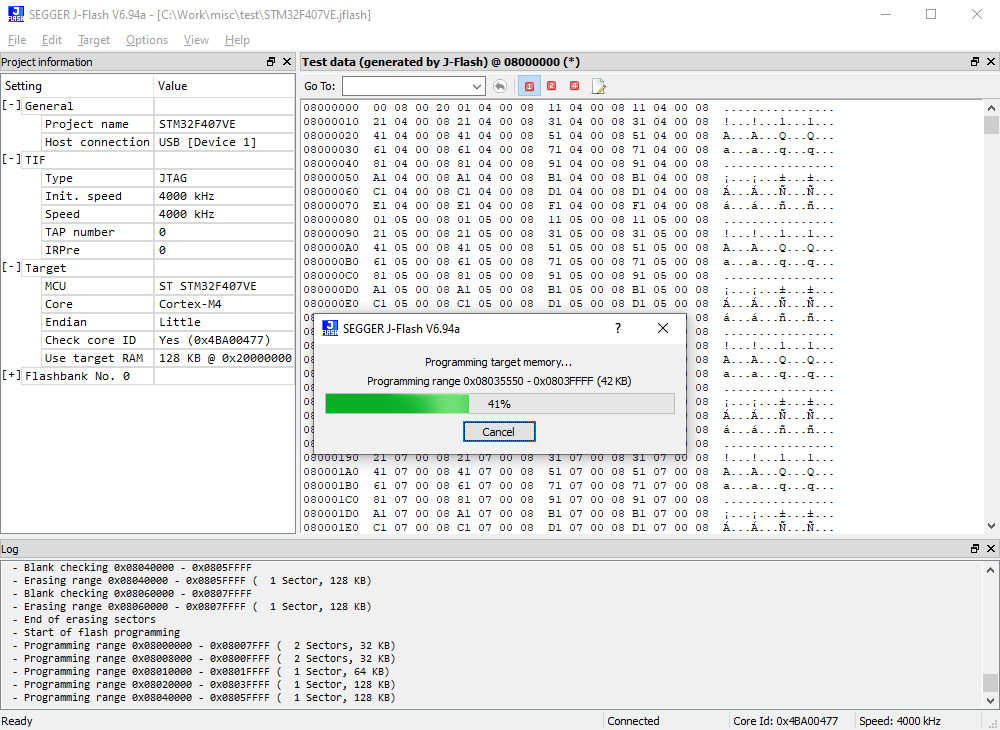 Information on the performance values can be found in the tables below. Device series, program and program verification are indicated in the tables. They provide an illustration of example values with frequently used devices. This demonstrates the write performance for flash memory of J-Flash and J-Link.