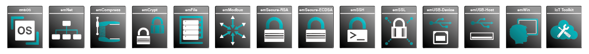 The Embedded Studio PRO Library Package includes our core components (RTOS, GUI, File System) and communication software (TCP/IP, USB-Device, USB-Host, Modbus), as well as our IoT Toolkit, Security and Compression modules serving all software needs of modern embedded industrial and IoT devices. Each component is supplied as libraries for any Cortex-M microprocessor and can easily be enabled in your new projects. All libraries are run-time configurable for flexible use in any application.