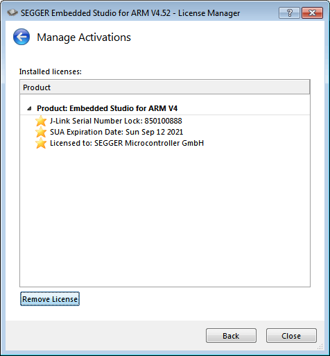 The activation is stored on a J-Link, which serves as a USB dongle for portable use of the license.