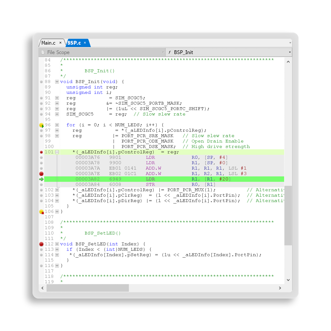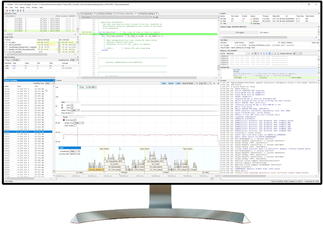 Ozone assists developers with all common features of a modern debugger. This includes a full-fledged source code window including syntax-highlighting, as well as symbol and data windows and register and memory displays. Ozone goes beyond typical debugging use cases to enable efficient and extensive debugging within a fully integrated user interface.