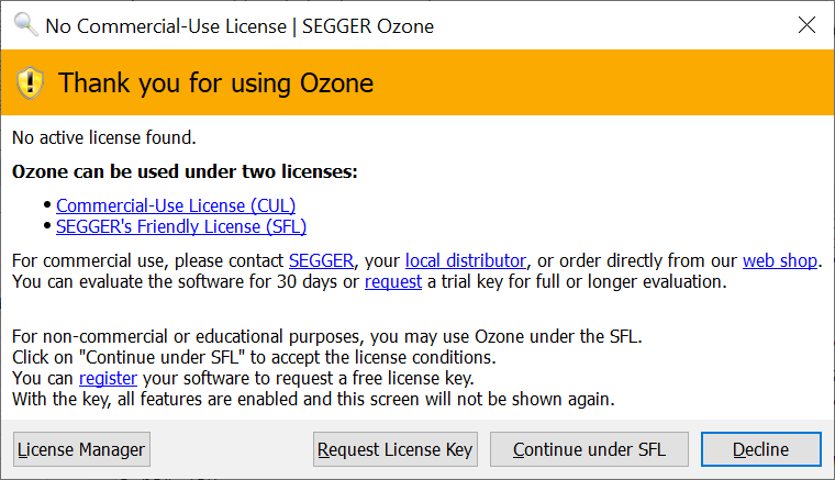 Ozone is available as a SEGGER Software Tool under SEGGER's Friendly License for non-commercial use and SEGGER's Commercial-use License.