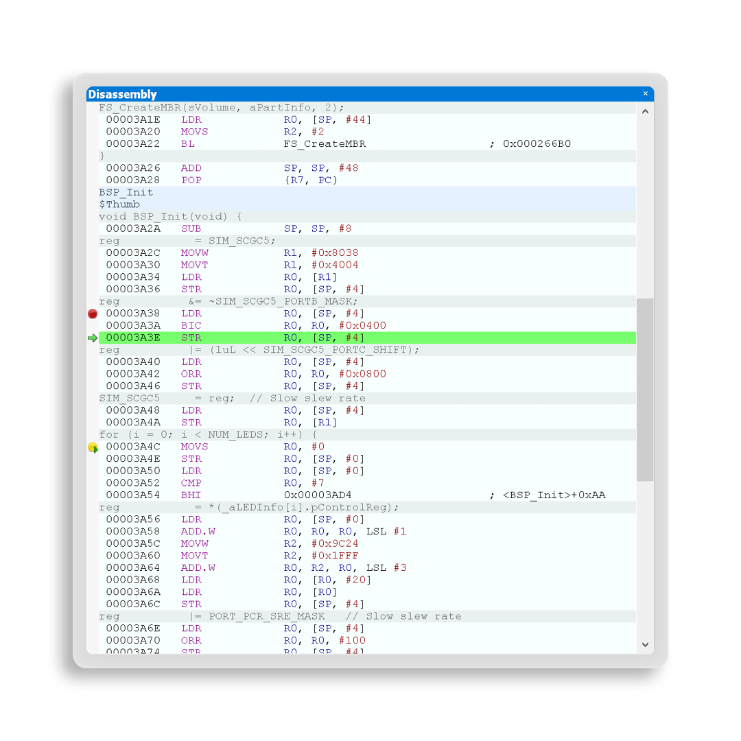 The Source Code Viewer's most valuable feature for embedded firmware development is its inline disassembly view.