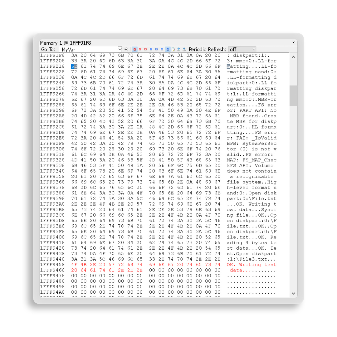 The Memory window provides a view into the target system's Flash and RAM. It displays memory contents in a hex editor, which allows memory to be read and modified. In addition, the ASCII representation helps with easy identification of strings and patterns. All data symbols can be revealed and highlighted in the Memory window to aid analysis of complex structs and arrays, as well as symbol surroundings.