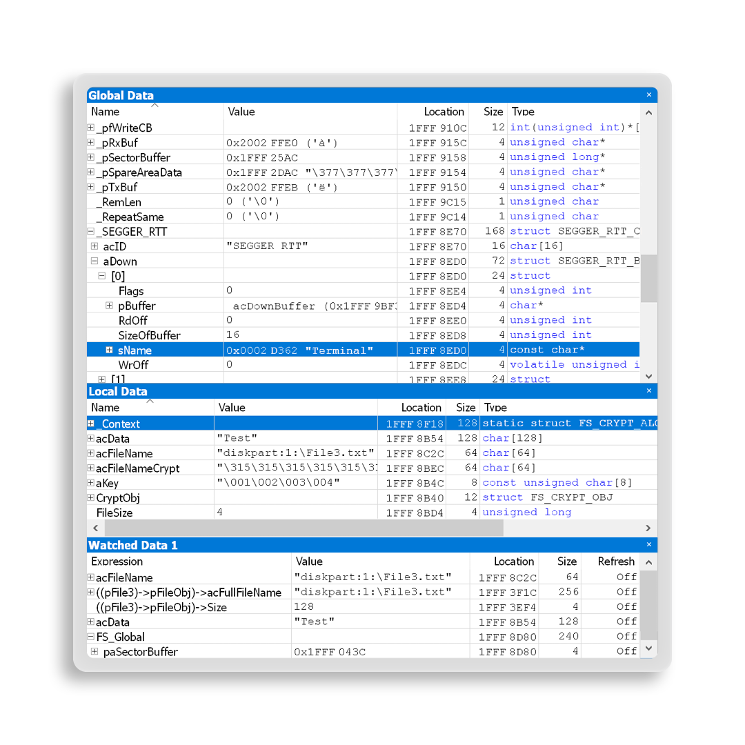 Data symbols can be analyzed in three windows, that offer easy access to relevant information and high flexibility. The Global Data window includes all global and static symbols, that provides a full overview of data used by the system. The Local Data window adds local symbols, that are present in the currently active function or code block. The Watched Data windows provide full flexibility to selectively view global data symbols, single members of a struct or array, and expressions.