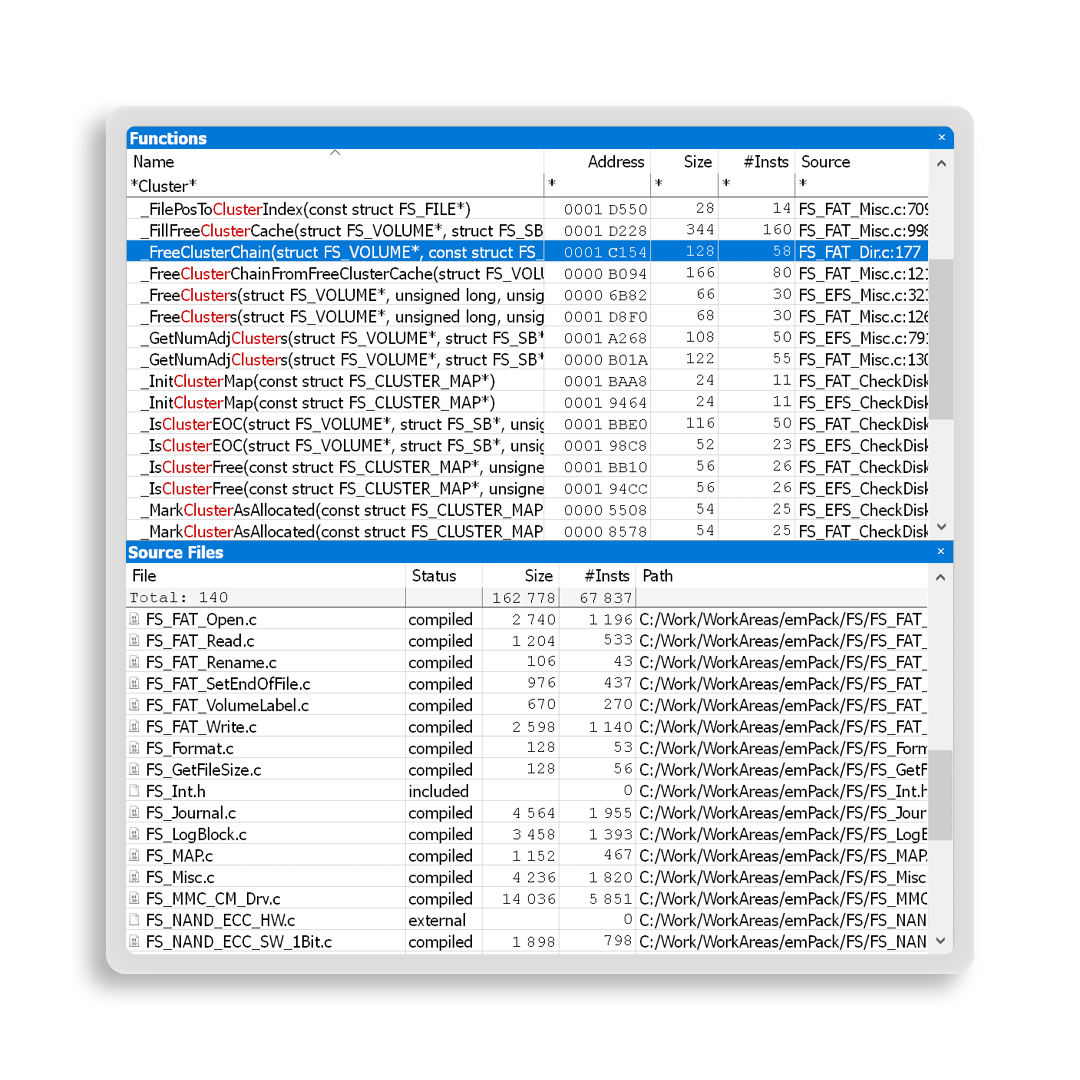 Ozone can display lists of all functions and source files stored within firmware debug information. With the Functions window, these items are viewable in memory as disassembly code, or directly in a source file. The list includes information about addresses, sizes, and numbers of instances. The Source Files window provides information about status (included or compiled) and the location on the file system at build time. Compiled files are also listed with information on size and numbers of instances.