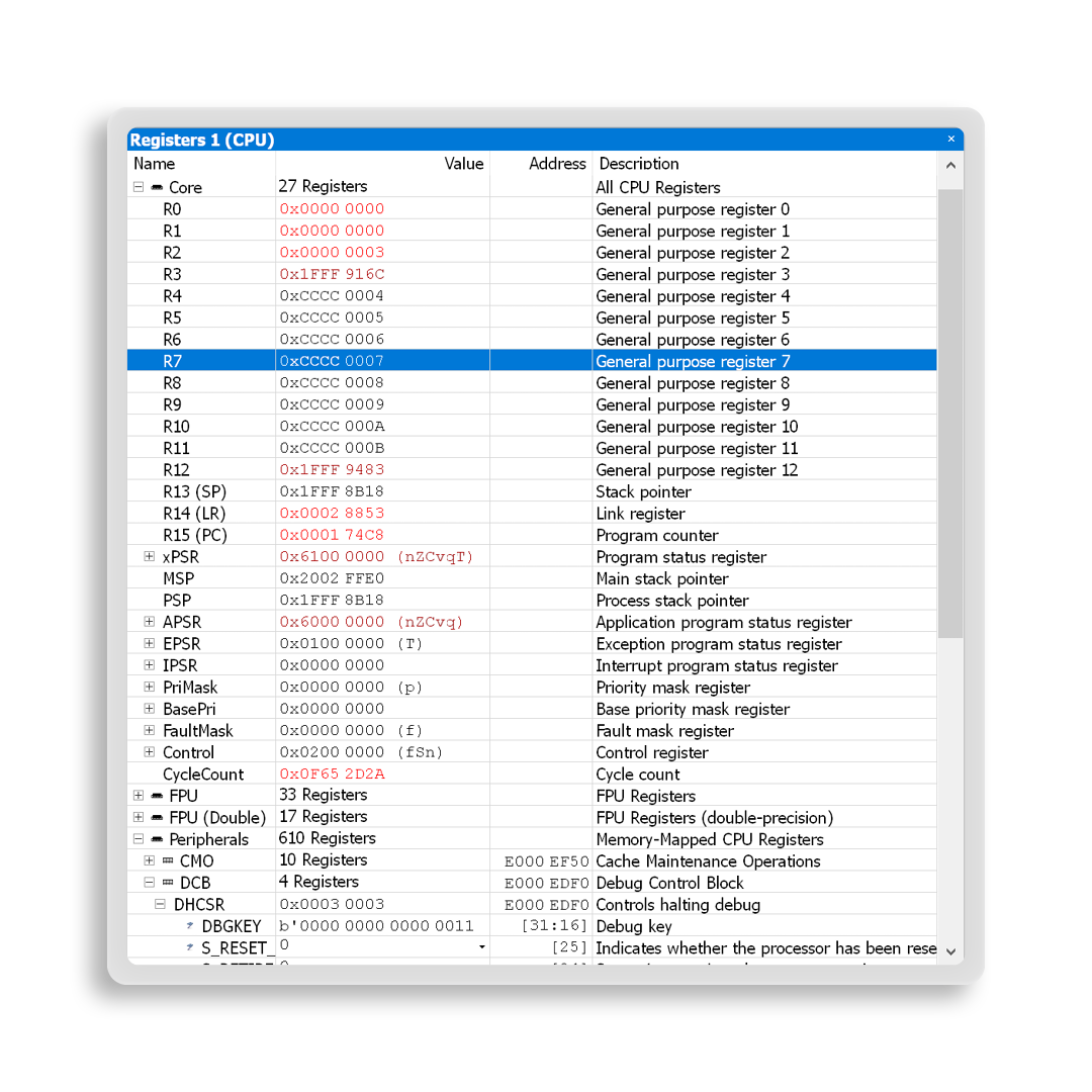 The Registers window enables closer analysis of the state and behavior of a CPU and its peripherals. Ozone displays CPU registers, including control and status registers and their fields, as well as co-processor registers. Additionally, Ozone can display memory-mapped peripheral registers (SFRs). The registers are organized in groups, that can be selectively added and expanded. For full flexibility Ozone features multiple instances of Register windows, that further help to organize register groups and keep important information in view.