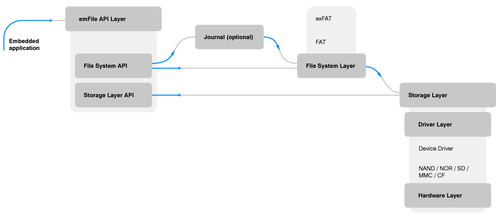 emFile is organized in 5 layers (API, file-system, storage, device, and hardware layers) and is designed with security in mind. Therefore, all access operations are atomic, which helps ensure data consistency.