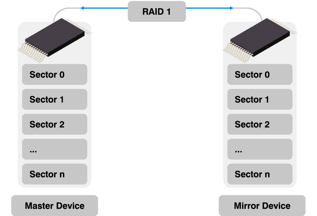 Diagram illustrating RAID 1 configuration with two devices: a Master Device on the left and a Mirror Device on the right. Each device contains identical sectors (0 to n) to ensure data redundancy and protection. The connection is labeled "RAID 1" to indicate the mirroring process.