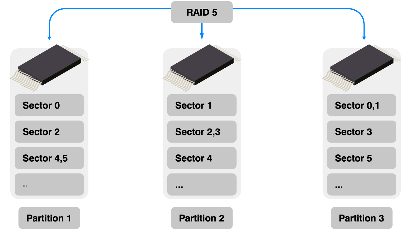 The diagram illustrates the structure of RAID 5 with three partitions. Each partition contains sectors labeled 0, 1, 2, and corresponding data distributions, showcasing the organization of data across multiple drives for redundancy and performance.
