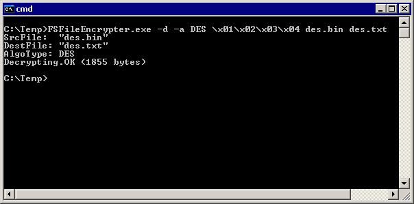 The file encrypted on the target system can be decrypted on a PC using the File Encrypter command line tool. The following screenshot shows the messages printed out by utily while decrypting the contents of the des.bin file. The decripted contents is stored to des.txt file. In this case the encryption algorithm used is DES as specified unsing the -a option. The File Encrypter utility shows information about the progress of the decrypting process. In case of an error, a message is displayed and the utility returns with a status of 1 and the file is not decrypted.