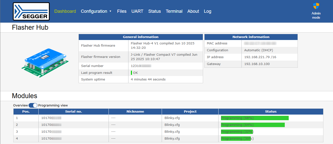 The built-in web server of the Flasher Hub-4 (using emWeb) simplifies configuration and setup of the programming system. In addition, it offers options to check status information remotely and to manage firmware images.