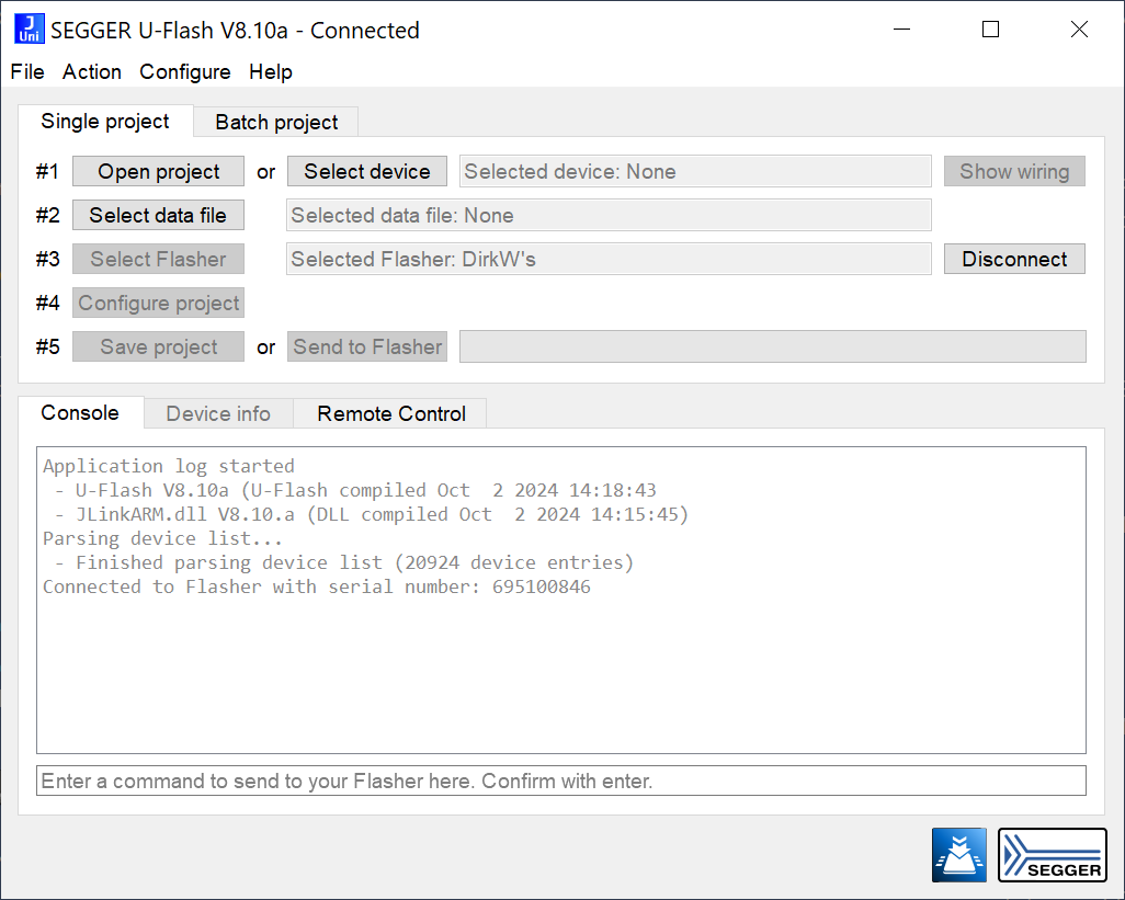 U‑Flash provides an interface for configuring Flasher production programmers for use. Within the interface, users can select single or batch projects (i.e., the programming of a single device/memory region or multiple devices/memory regions) and access all necessary data files for programming and verification.