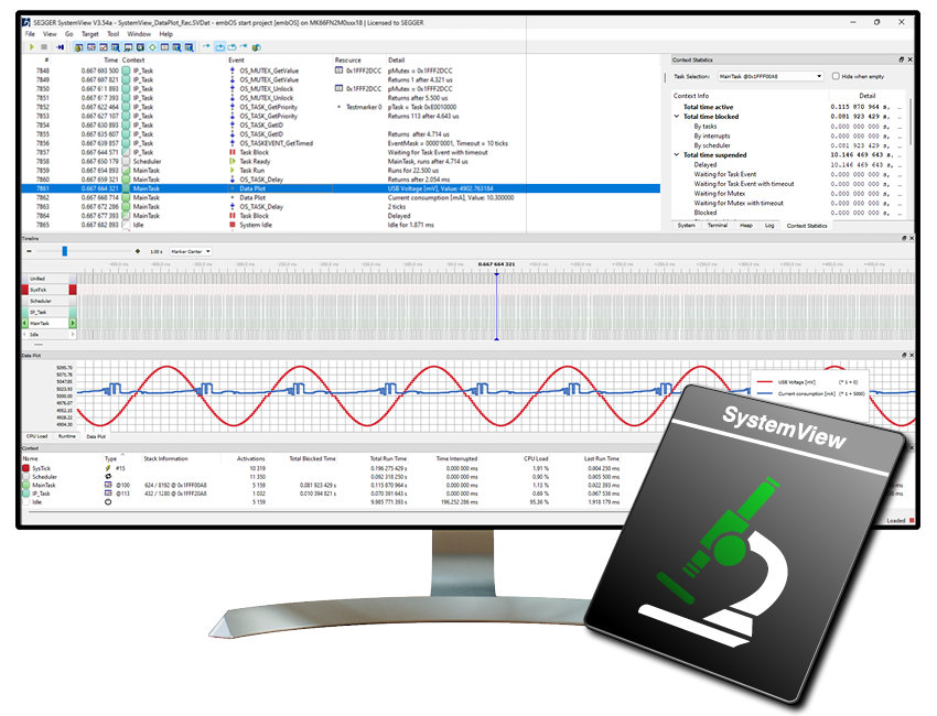 SystemView offers powerful visualization options, including the DataPlot window for displaying recorded data as curves, and it supports both live runtime analysis and post-run evaluation. The tool connects via J-Link, SEGGER RTT technology, IP, or UART.